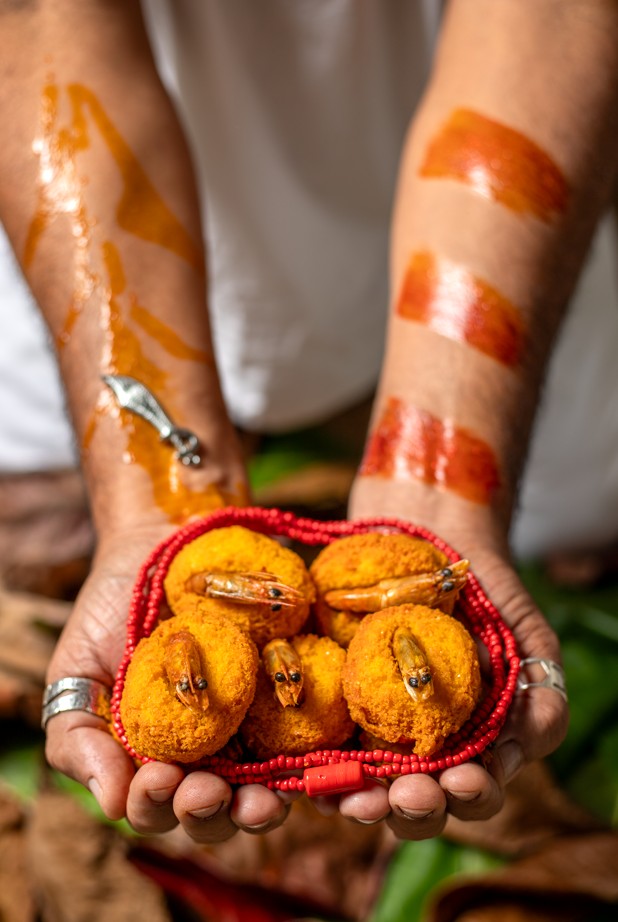 “Um dia antes da estreia da exposição, o Instituto Guimarães Rosa se encheu de vozes miúdas, risadas curiosas e olhos atentos. Recebemos crianças da comunidade afro-paraguaia Kamba Cuá, convidadas para um encontro que é também um elo entre o Brasil e o Paraguai, o passado e o presente, o sagrado e a matéria. Contamos para elas as histórias dos Orixás; de como Exu abre caminhos, de como Oxum mora nas águas doces, de como Xangô fala pelo trovão“, explica André.